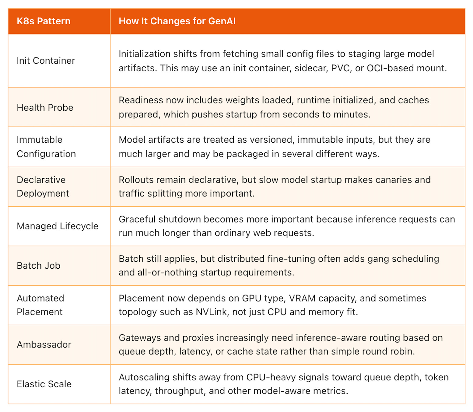 A few years ago, Roland Huss and I wrote Kubernetes Patterns, a catalogue of repeatable solutions for building cloud-native applications on Kubernetes. The book covers patterns across six categories: foundational, behavioral, structural, configuration, security, and advanced, everything from health probes and init containers to controllers, operators, and elastic scaling. Recently, Roland and Daniele Zonca co-authored a new book, Generative AI on Kubernetes, which covers the operational side of running LLMs on Kubernetes. I was a reviewer on that book, and the more I read through it, the more I recognized patterns from our original work, just applied to a very different class of workload. Deployments, StatefulSets, Init Containers, DaemonSets. They were all there. Just with bigger numbers.