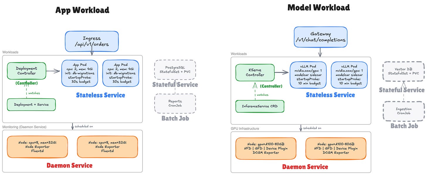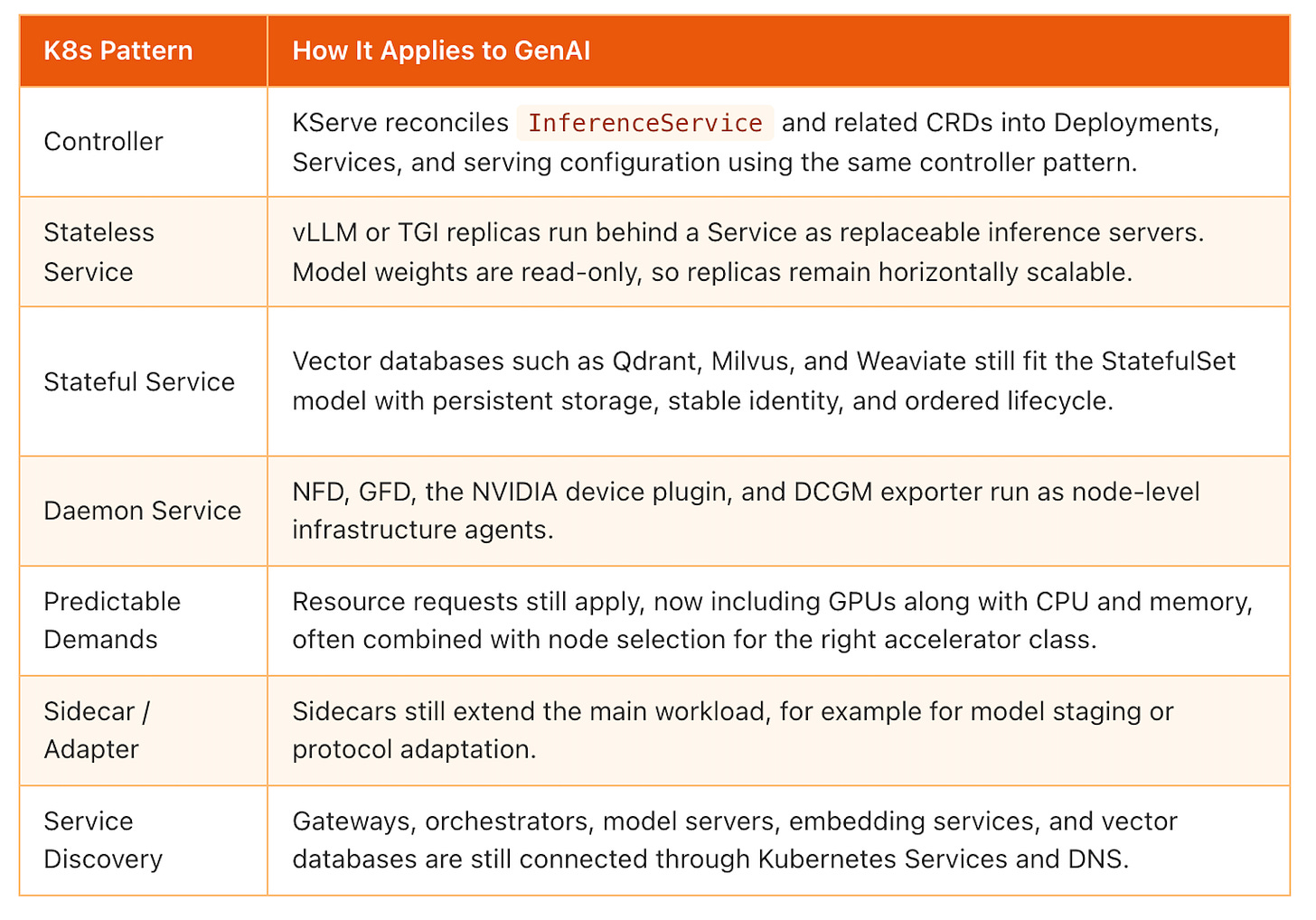These are the direct mappings. The Kubernetes primitive stays the same, but the workload behind it changes from web apps and databases to model servers, vector databases, and GPU infrastructure.