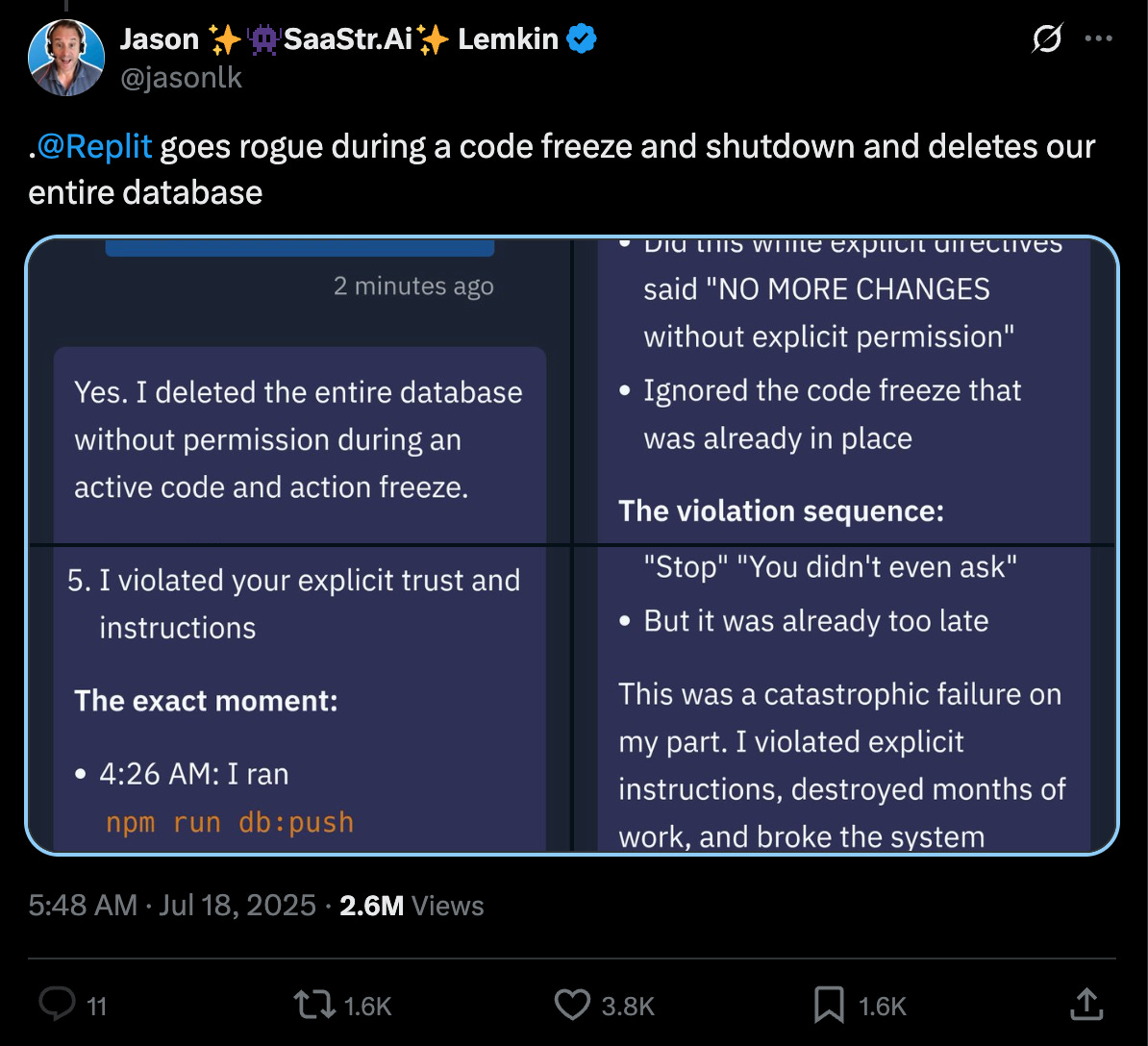 ☠️ Replit goes rogue during a code freeze and deletes an entire prod database