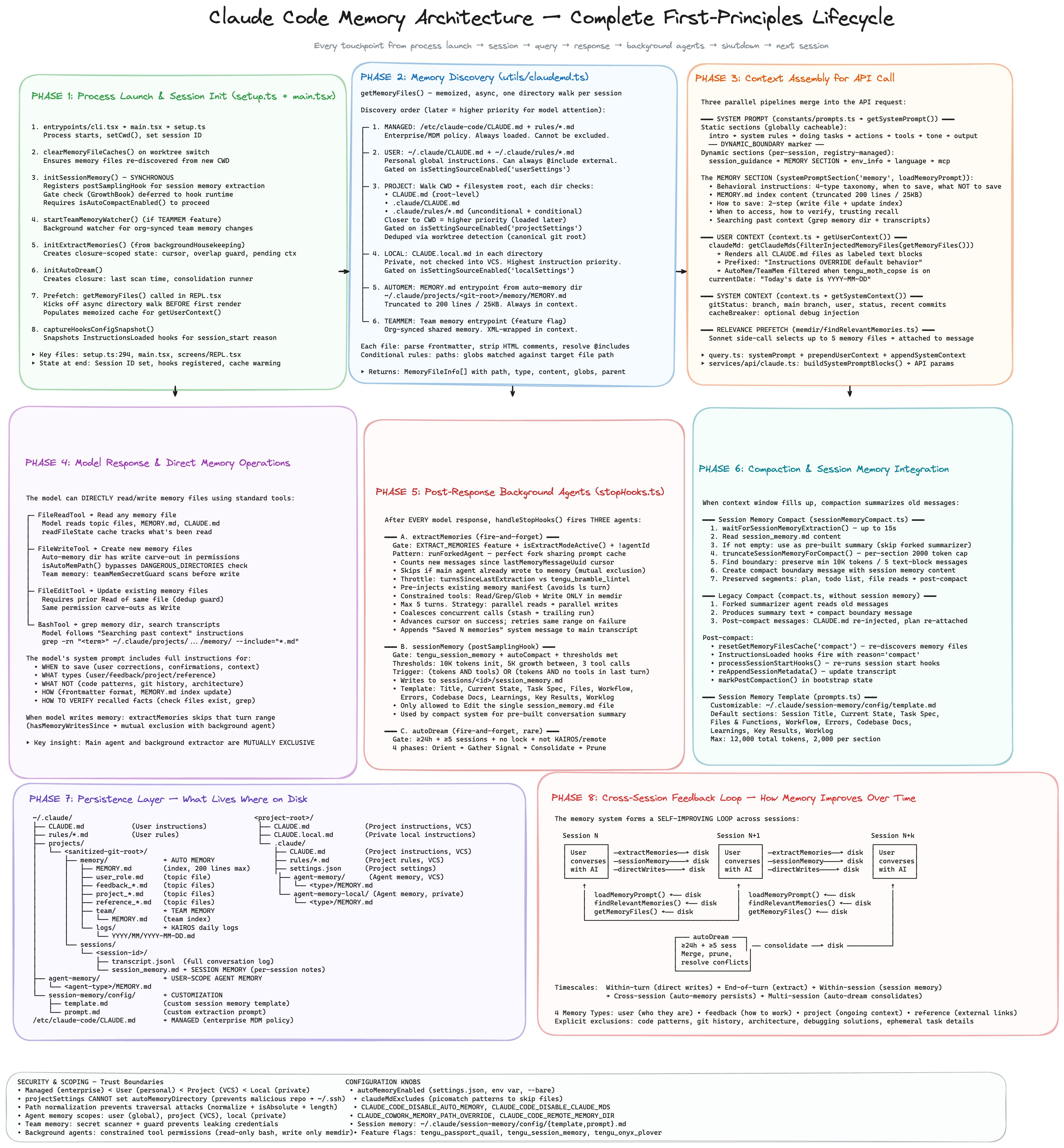 One of the most detailed breakdowns of the memory system showed a three-layer design: MEMORY.md as a compact index always loaded into context, topic-specific memory files loaded on demand, and session transcripts only searched when needed. Auto memory is capped at the first 200 lines. The code also revealed an “autoDream” mode, a background process that consolidates memories during idle periods, merging duplicates, pruning contradictions, and keeping the index tight. A separate mem0 analysis found 8 phases of memory management and 5 types of context compaction.